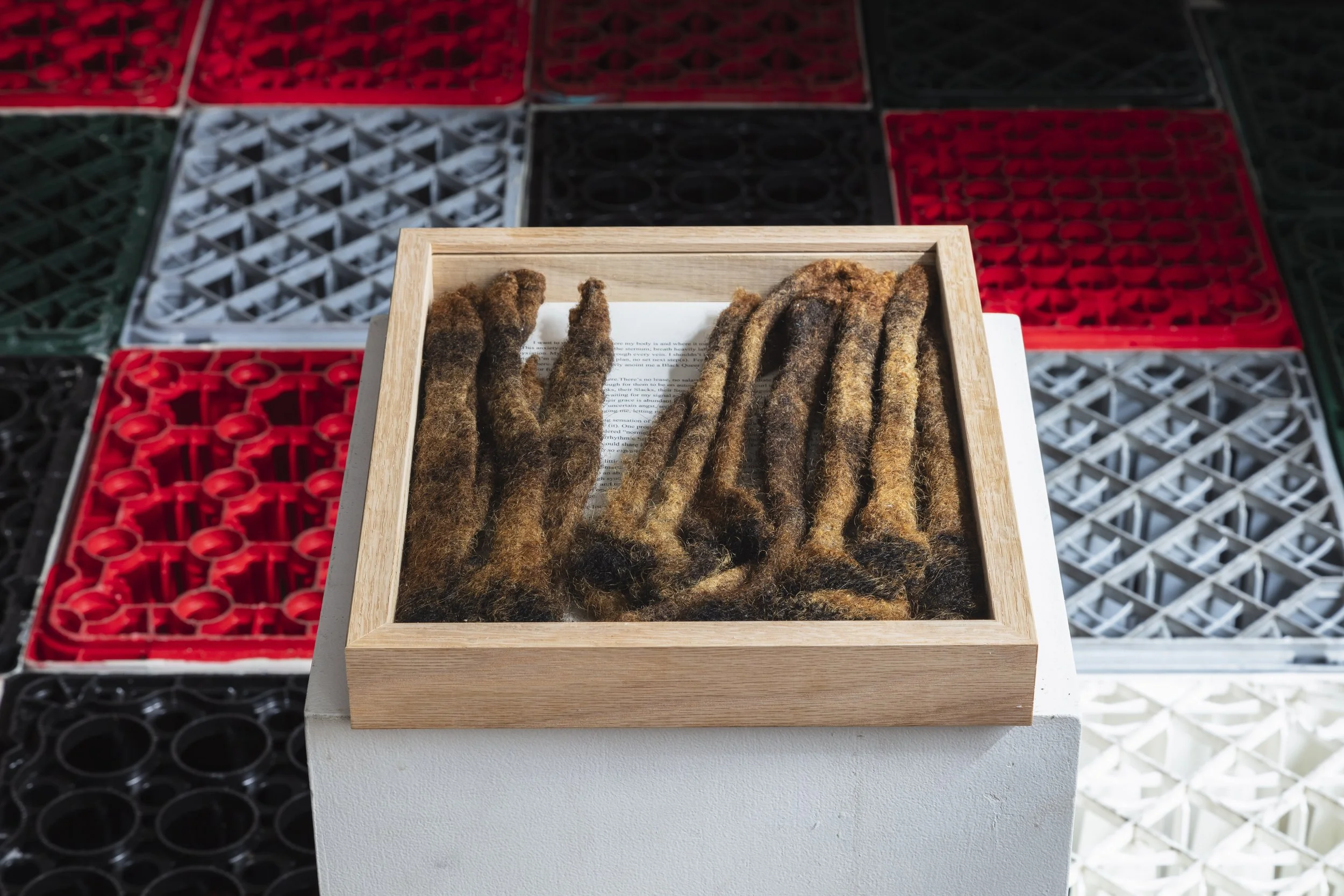 Materials: Locs, Oak wood, glass, wood pulp based paper, ink.